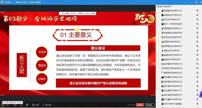 学生第三党支部党员母佳琪作为主讲人,从遵义会议的历史背景、过程、历史地位、精神内涵四个方面讲述,并播放了影片《血战湘江,遵义转折》的精彩片段。同学们纷纷表示,通过本次学习感受到了革命的艰辛和伟大,深刻领会到了遵义会议精神的时代价值。