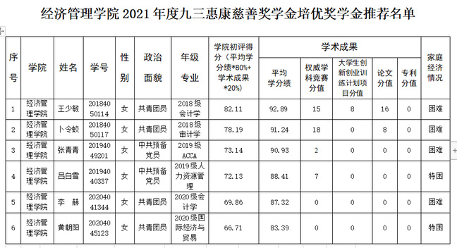 依据黑龙江八一农垦大学下发《关于评选2021年度九三惠康慈善奖学金的通知》,yl6809永利官网在学生自主申报基础上经过学院评审委员会审核,按照《培优奖学金打分体系》得分高低进行排序,推荐王少敏等6名同学参评黑龙江八一农垦大学2021年度九三惠康慈善奖学金培优奖学金评选,推荐武思平等2名同学参评黑龙江八一农垦大学2021年度九三惠康慈善奖学金“双困生”就业补助金评选,现将评审结果公示。