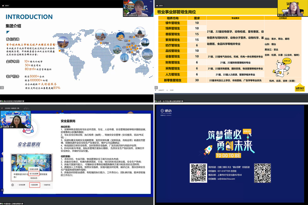 会议邀请了中通快递股份有限公司、认养一头牛控股集团股份有限公司、上海德必文化创意产业发展(集团)股份有限公司三家行业知名企业参加,通过播放企业宣传片、线上集中宣讲等方式推介就业岗位。校方参会人员与企业代表进行了线上交流。