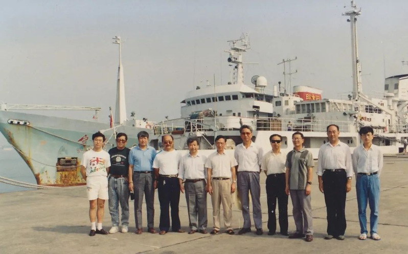 1994年南海考察远航归来,考察队员与前来迎接的同志们合影。杨士莪(左四)、杨德森(左二,2015年当选中国工程院院士)、张仁和(左六,中国科学院院士)
