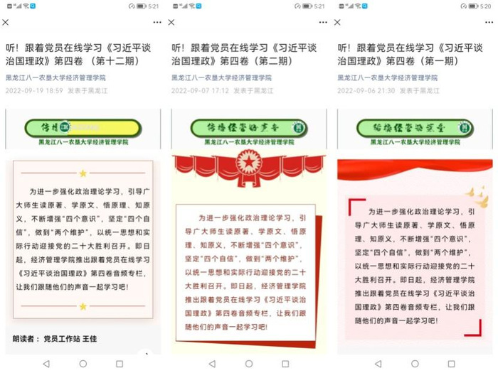 自9月6日开始,学院在“新媒体”平台推出跟着党员在线学习《习近平谈治国理政》第四卷的音频专栏,党员们精心录制,拟推出30期,使全院师生能够天天学、时时学、处处学,学生党员们用青春的声音传播理论、传递精神、传承信仰,为理论学习注入生机活力。