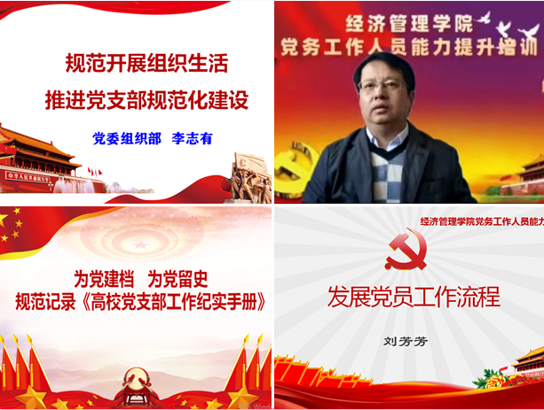 培训采用集中辅导的方式进行,校党委组织部李志有、吴国军,学院党委书记单忠纪、组织员刘芳芳分别作《规范开展组织生活推进党支部规范化建设》《规范记录<高校党支部工作纪实手册>》《走进主题党日活动》和《发展党员工作流程》专题讲座。