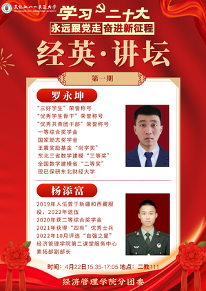 为学习贯彻党的二十大精神,加强学风建设,发挥榜样力量,引导学生以学为舟,奋楫笃行,4月22日,yl6809永利官网在二教111室举办以“学习二十大,永远跟党走,奋进新征程”为主题的“经英”讲坛,邀请国家奖学金获得者、2019级物流管理专业学生罗永坤,“经管之星”代表、2021级会计学专业学生杨添富进行经验分享,200余名学生参加本次活动。