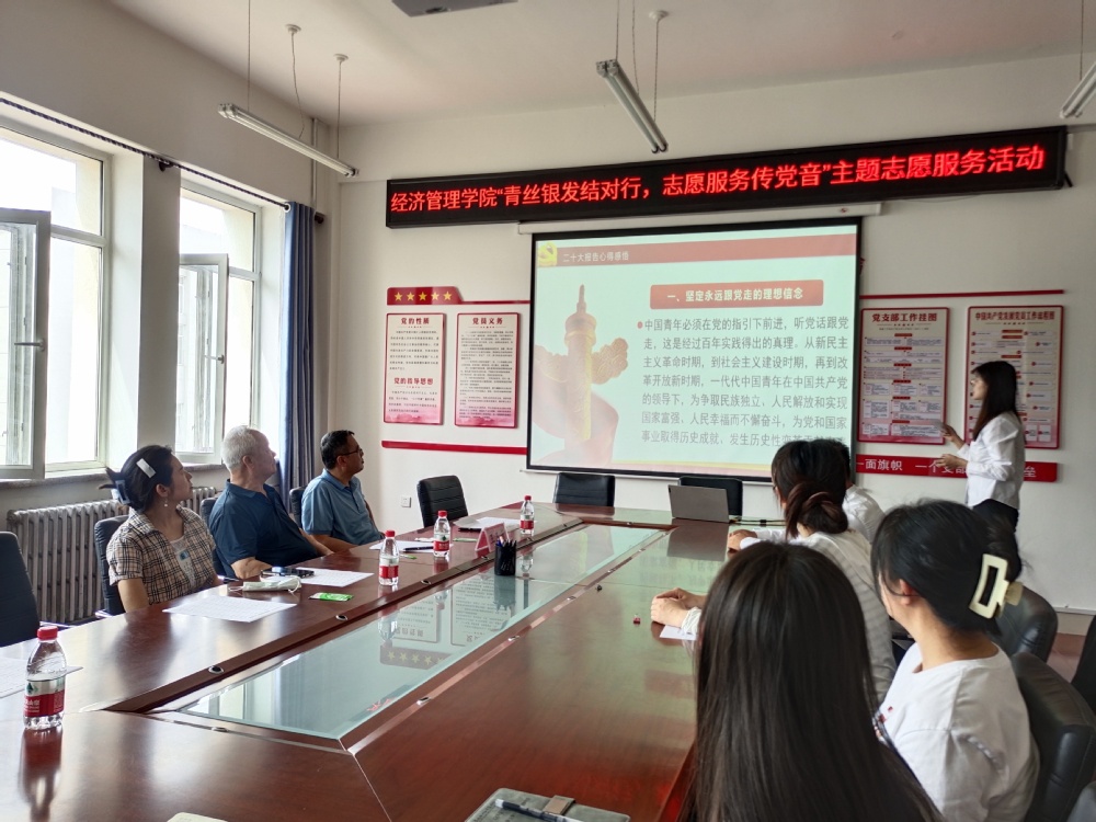 为深入开展学习贯彻习近平新时代中国特色社会主义思想主题教育,7月2日,yl6809永利官网在党建会议室举办“青丝银发结对行,志愿服务传党音”主题志愿服务活动,退休老干部王玉芳、yl6809永利官网党委副书记闯垒、离退休工作处付子芳、yl6809永利官网辅导员金馨悦参加本次活动。