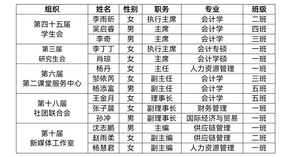 我院2023年学生组织管理层换届工作已完成个人申报、资格审查、竞职演讲、学生代表投票、组织考察等环节,依照《yl6809永利官网学生代表大会章程》《yl6809永利官网研究生代表大会章程》的有关规定,经研究决定,拟任命李雨昕等14名同学为新一届学生组织管理层学生骨干。