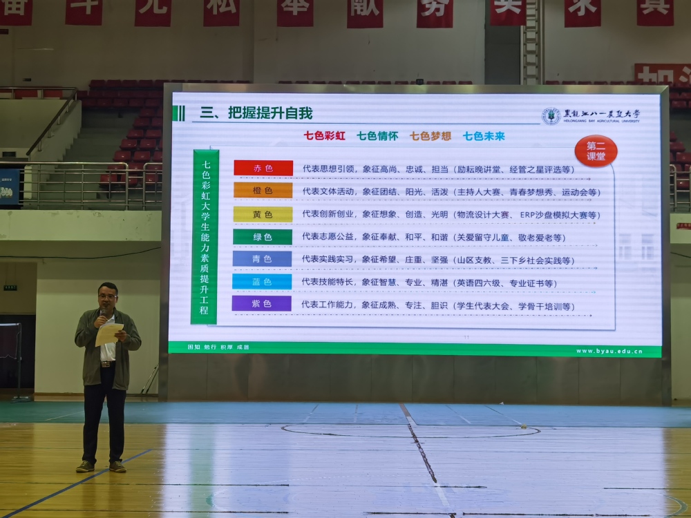 学院党委副书记闯垒以“珍惜大学生活,争做文明学生”为题,详细解读“七色彩虹”大学生能力素质提升工程,鼓励新生明确大学学习使命,准确定位人生目标,做好个人发展规划,迎接美好大学生活,为新生讲授了一堂生动的职业生涯指导课程。