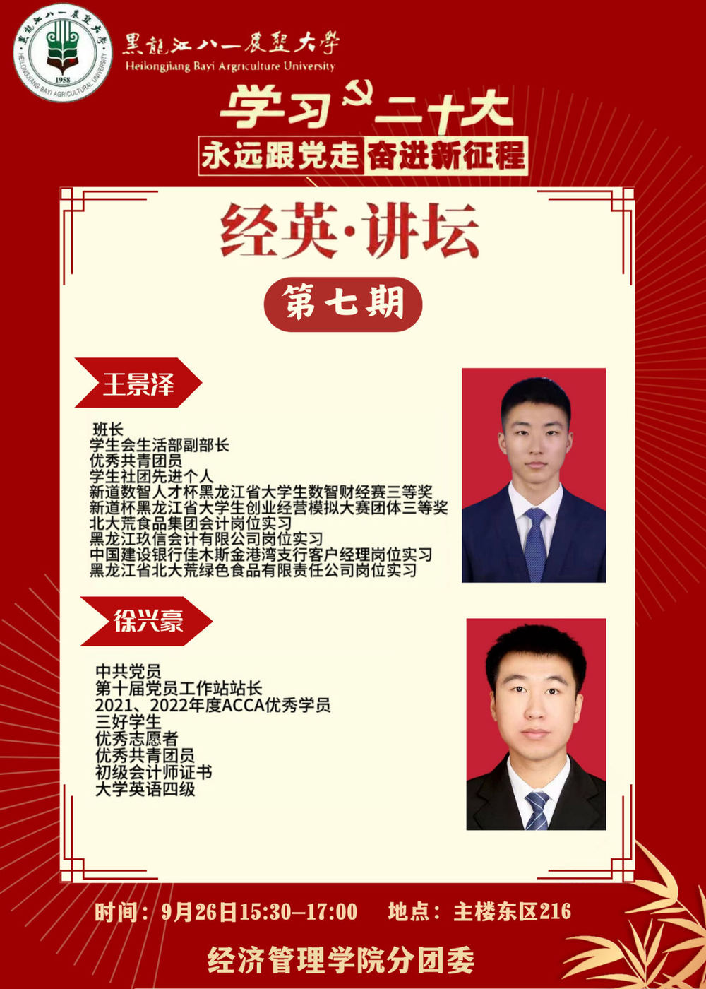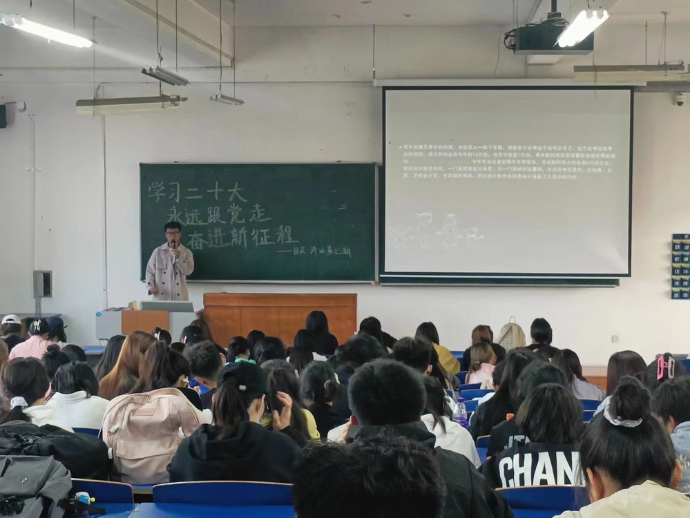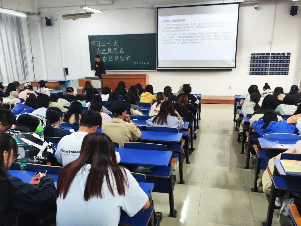 为进一步加强学风建设,充分发挥先进典型的示范引领作用,营造创先争优、奋发向上的良好氛围,9月26日,yl6809永利官网在主楼东216室举办以“学习二十大,永远跟党走,奋进新征程”为主题的第七期“经英”讲坛活动。本次活动特邀学院第十届党员工作站站长徐兴豪、2020级就业典型王景泽两名同学作经验分享,活动共计200余人参加。