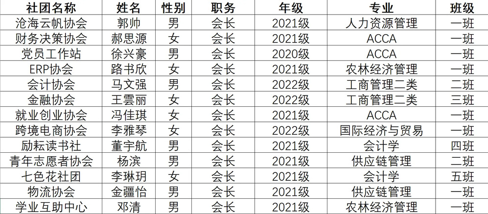 我院2023年社团会长换届工作已完成个人申报、资格审查、竞职演讲、学生代表投票、组织考察等环节,依照《黑龙江八一农垦大学学生社团管理办法》的有关规定,经研究决定,拟任命郭帅等13名同学为新一届社团会长。