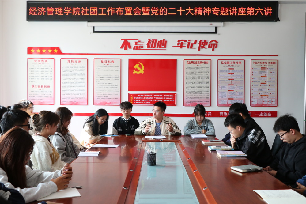 为深入学习贯彻党的二十大精神,提高学生社团成员的思想政治素质,加强学生社团管理,促进社团规范发展,发挥学生社团的思想引领作用,按照学院党委“五讲四进三做三融合”工作部署,10月8日,yl6809永利官网在党建会议室举办社团工作布置会暨党的二十大精神进社团专题讲座第六讲,社团联合会指导教师初金哲、社团联合会管理层、各社团对接人以及全体社团会长参加本次会议。