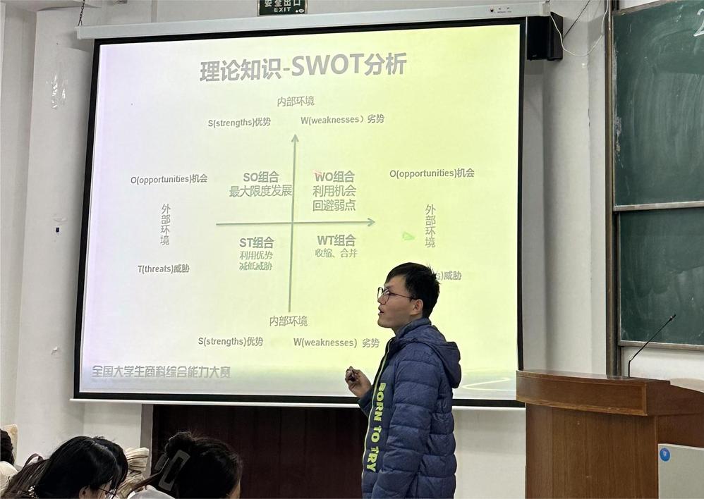 获得2023年全国大学生商科综合能力大赛团体三等奖的团队负责人杨滨作赛后经验分享。杨滨从赛事介绍、竞赛系统介绍、竞赛系统决策要点、竞赛系统相关理论四个方面进行详细解读,着重介绍竞赛系统平台策鸿国际企业经营模拟软件及参加竞赛的相关流程,进一步加深同学们对全国大学生商科综合能力大赛的了解,鼓励同学们积极参加学科竞赛,在竞赛中掌握知识和技能,提升自身专业实践能力。