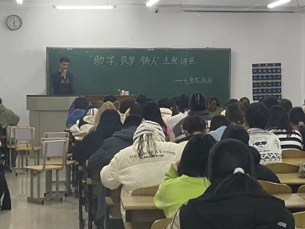 七色花社团成员高杰作国家助学金资助政策宣传,从国家助学金申请条件、评审与程序、发放与管理以及申请表填写注意事项四个方面进行详细讲解,并作国家助学金及其它学生资助政策常见问题解答,提醒同学们申请各类资助时恪守诚信,提供的资料必须真实准确。