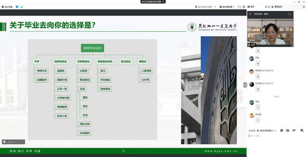 赵玥以《认清未来大势 破除就业迷思》为题,从宏观就业环境着手,结合我省政府工作报告分析了产业行业环境,从近两年毕业生就业去向、就业期待、求职心态与行为、求职进展等维度,具体分析了新一阶段的就业求职发展形势,指导学生应主动积极关注外部环境,树立积极求职心态,从个人实际和社会需求出发,主动投身求职活动,选择职业和工作岗位。