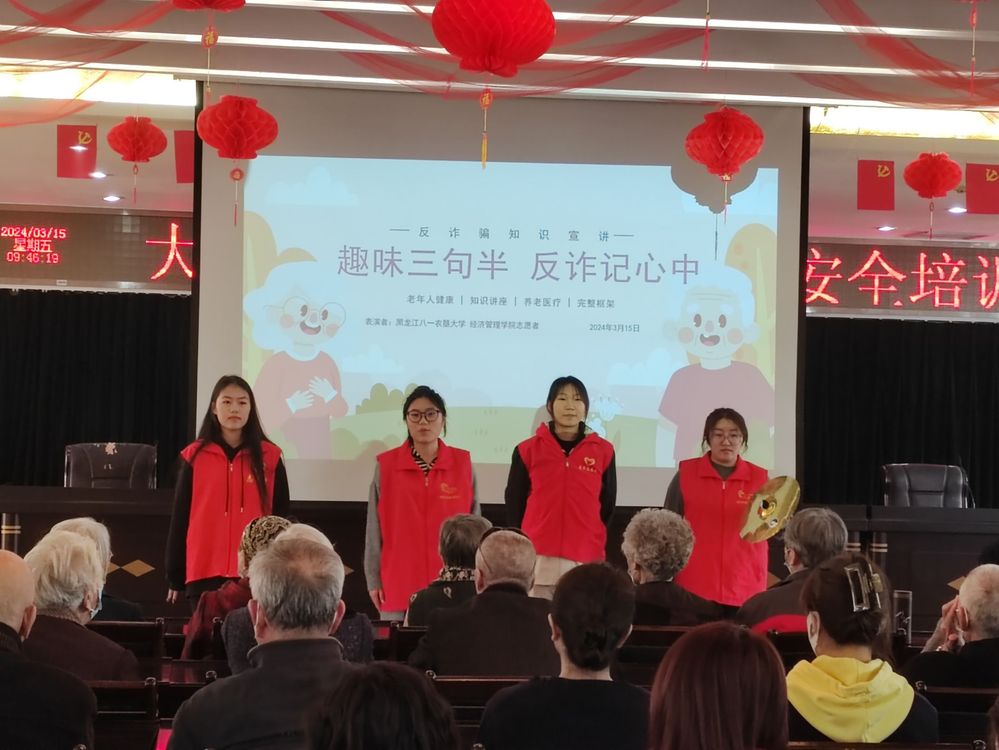 3月15日,yl6809永利官网组织志愿者赴大庆市第二福利院开展“防诈同行乐晚年,智慧识诈护安宁”防诈骗网络安全宣讲活动,大庆市第二福利院院长杜祥波、工作人员及老人们参加本次活动。