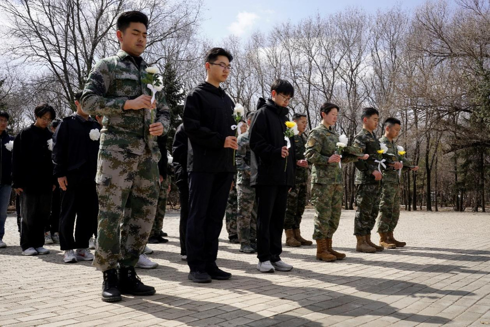 退役大学生士兵面向国旗,举起右拳,重温军人誓词,高唱《中国人民解放军军歌》《强军战歌》,郑重承诺将继承先烈遗志、传承革命精神,以实际行动践行退伍不褪色、退役不退志的初心。同学们依次上前向革命先烈敬献鲜花,缓步绕行一周,瞻仰英烈纪念碑,寄托无限哀思和怀念。