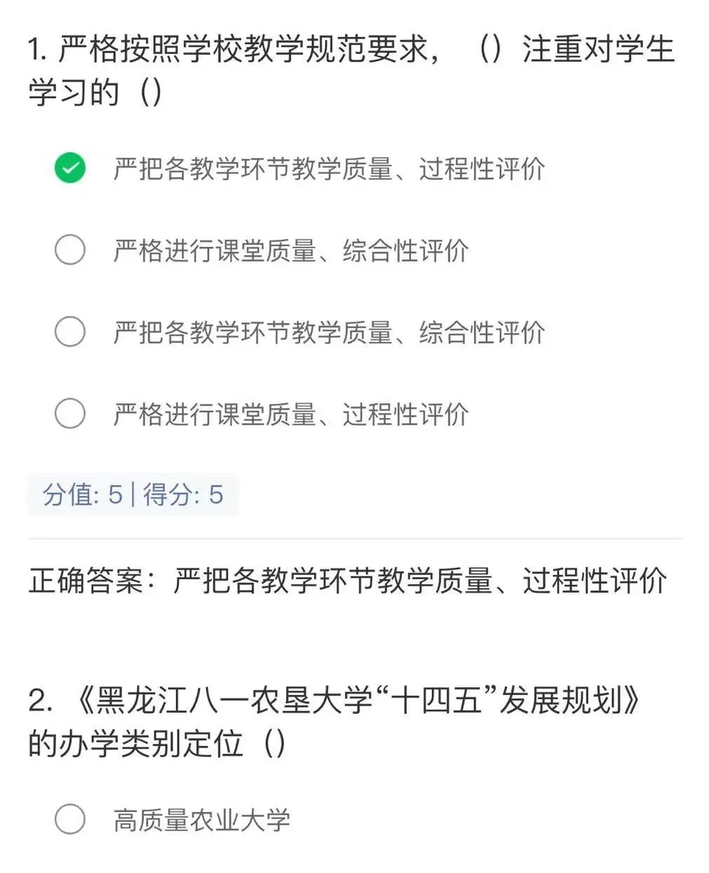 本次活动以线上答题形式开展,将持续10天,覆盖学院2000余名师生。每套试卷题型全面,设置选择、填空、判断共20道题,答题内容覆盖审核评估基本常识、校史校情基本问题、关键词解读、北大荒精神四个方面知识点。师生一致反映可以不受时间、地点的限制,边学边查边答,通过答题测试,达到了以赛促学、以学促行、持续深化巩固的良好效果。