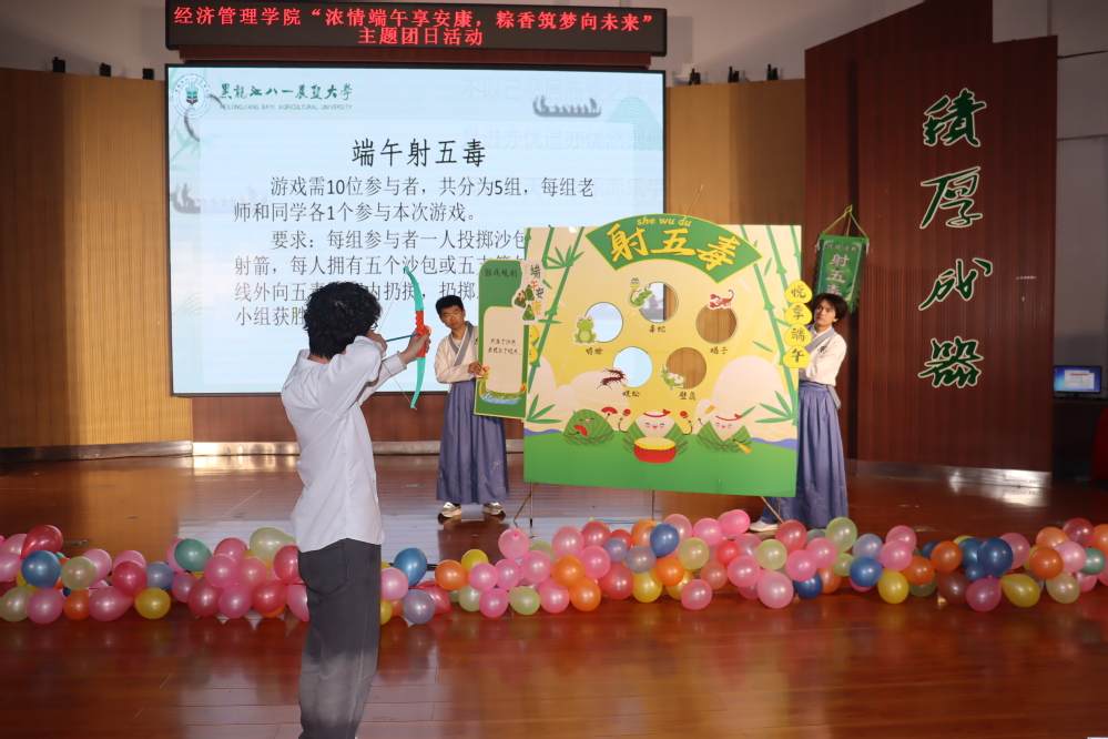 妙趣寄端午,香囊送安康。活动设置“粽”情投壶、射五毒、粽子运输机、蒙眼吃粽子等丰富有趣且带有端午特色的游戏环节,师生积极踊跃参与,观众席爆发出阵阵喝彩声,心意香囊作为奖励,将活动推向了高潮。