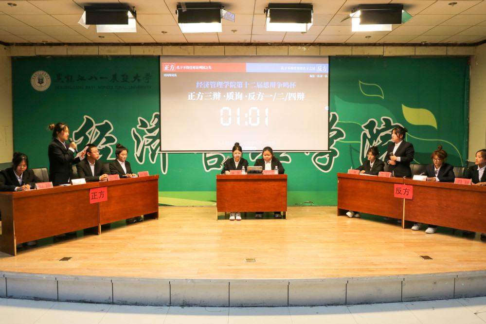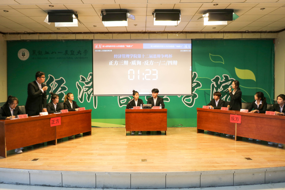 本次比赛分为班级赛和个人赛,经过初赛、复赛、半决赛的激烈角逐,2023级人力2班等四支队伍挺进决赛。班级赛以“初入职场的年轻人应不应该提倡‘钝感力’”为辩题,个人赛以“孔子不得任用是列国之失还是孔子之过”为辩题,正反双方辩手们凭借着敏锐的思维和出色的口才,展开了一轮又一轮精彩的辩论。正方辩手条理清晰,巧用事例论证己方观点;反方辩手则针锋相对,从不同的角度出发对正方观点进行有力反驳。在自由辩论环节,双方唇枪舌剑,你来我往间将比赛气氛推向高潮。