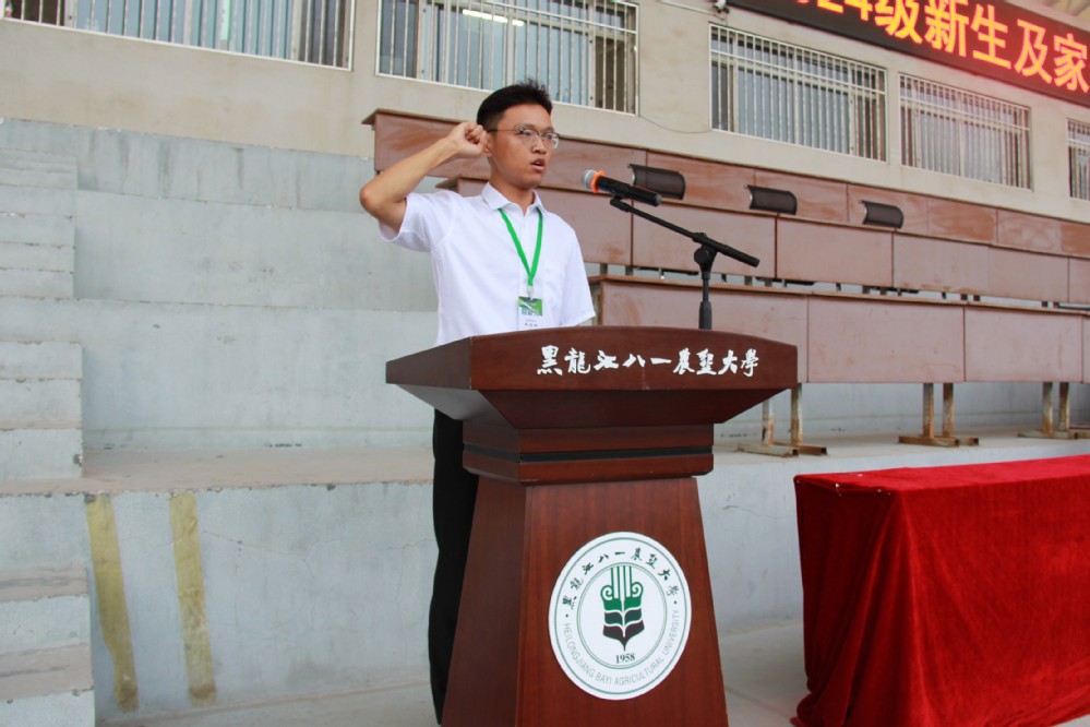 2024级辅导员乔辰军带领全体新生庄严宣誓:值我青春年华,融入美好农大;牢记父母嘱托,严守校规校纪;铭记青春使命,追求自信人生;困知勉行,积厚成器;今日,我是经管学子;明日,我是祖国栋梁。
