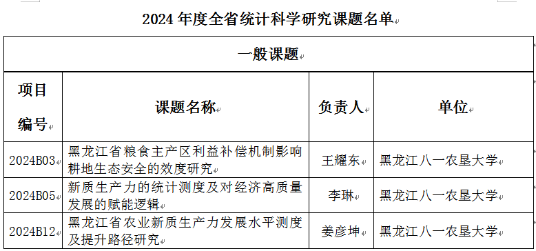 9月10日,黑龙江省统计局办公室公布了2024年度全省统计科研课题立项结果,此次获批课题分别为重点课题、一般课题,我院共有3项一般课题获批。