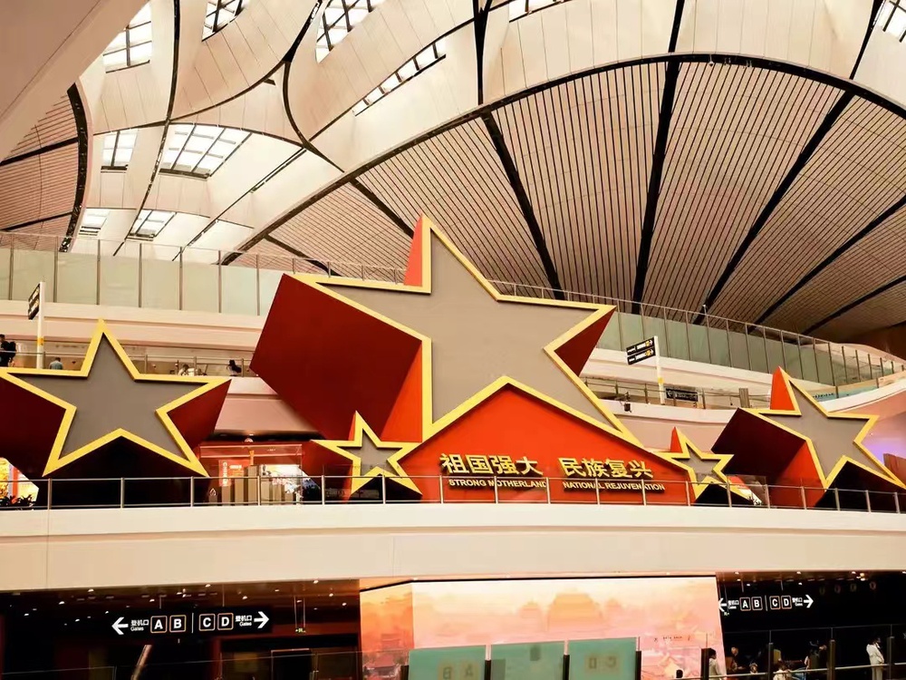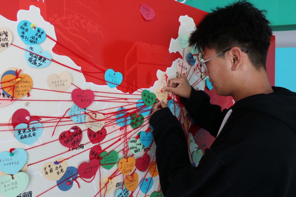 学院在经管楼大厅设置了用KT板制作的中国地图,经管学子在卡片上写下对祖国的美好祝福,利用细钉和红丝线将家乡与北京相连,“牵丝”地图成为国庆节期间学院最热门的网红打卡点。