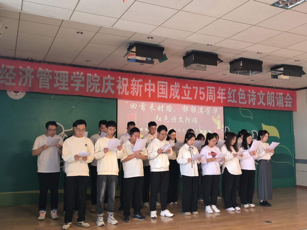 9月29日,学院在经管楼445报告厅举办红色诗文朗诵活动,2024级研究生以班级为单位倾情朗诵《华夏颂歌七十五载》《盛世中华,荣耀七十五载》等爱国主题诗歌,声音铿锵有力、句句动人,充分展现了青年学生的赤子之心和对祖国的无限热爱,活动现场高潮迭起、气氛热烈。